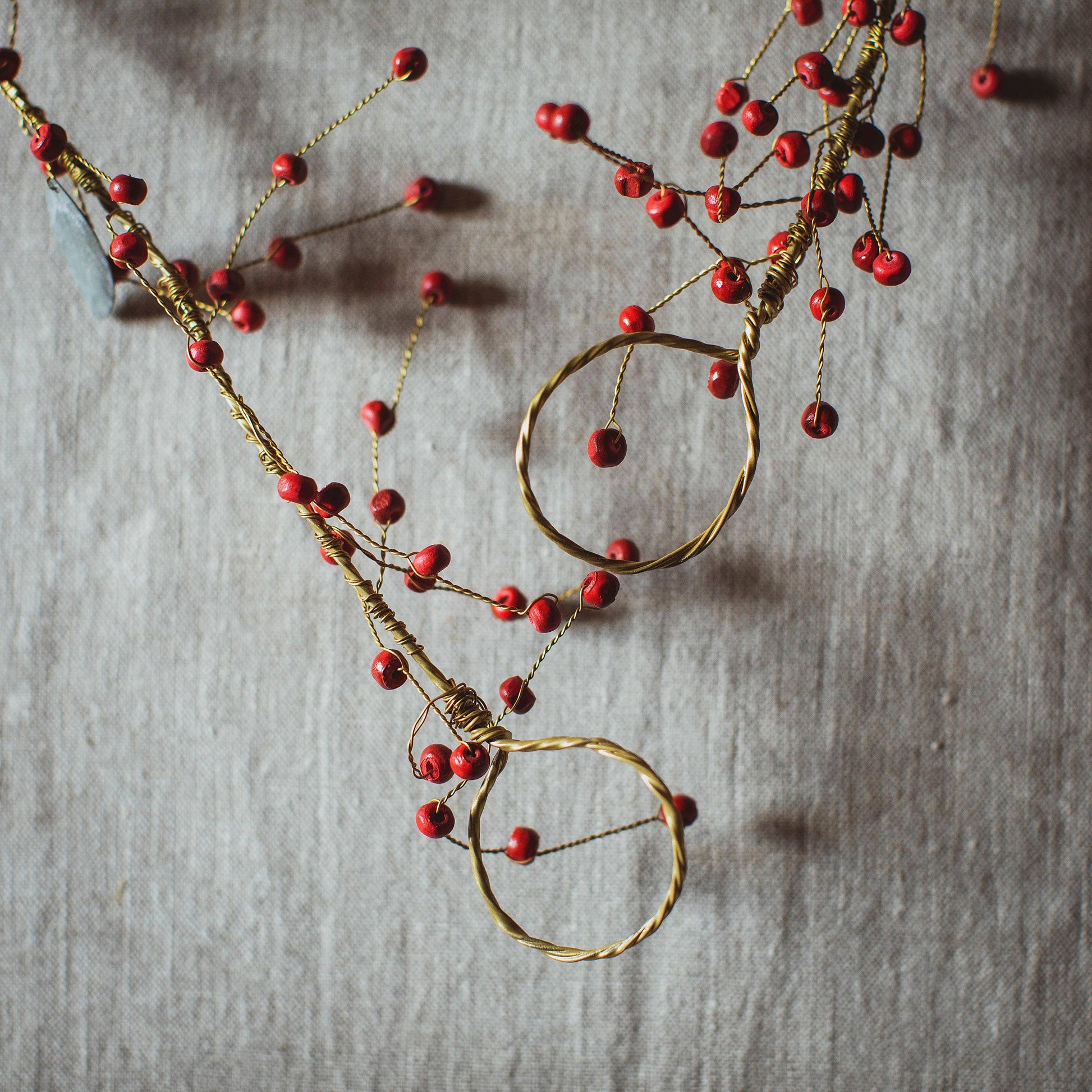 Brass garland with red berries and metal leaves. Round ends so that it may be hung.