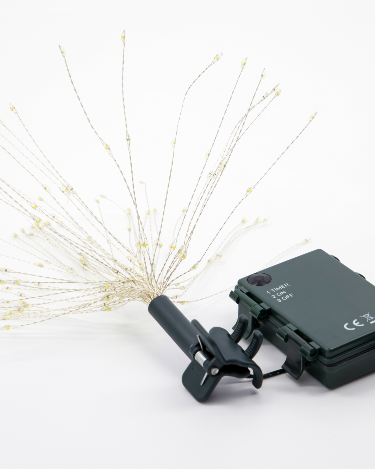 Make your Christmas tree shine with this LED top star. Featuring 180 small LED lights on delicate strings with a silver finish, it brings a radiant glow to your festive décor. Simply unfold the LED strings to create a brilliant starburst effect. The bottom clip ensures easy and secure fastening to your Christmas tree, while the battery-operated design includes a convenient timer function.